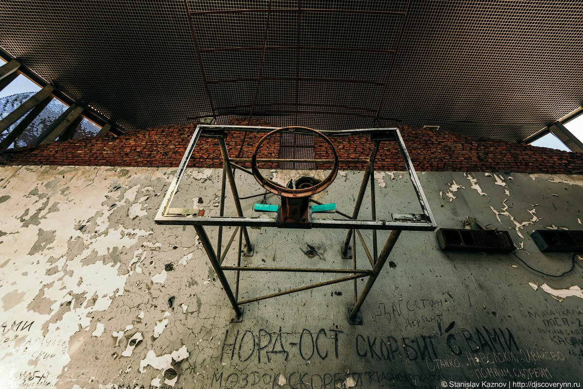 Внутренний вид на спортзал. Посредине установлен большой крест, рядом с которым горят свечи. Тишина. Даже редкие посетители ходят как будто бесшумно. Многие элементы конструкций сохранены в неприкосновенности, очень много обгоревших элементов и пулевых отверстий в стенах. Зал наполнен детскими игрушками и бутылками с питьевой водой.
