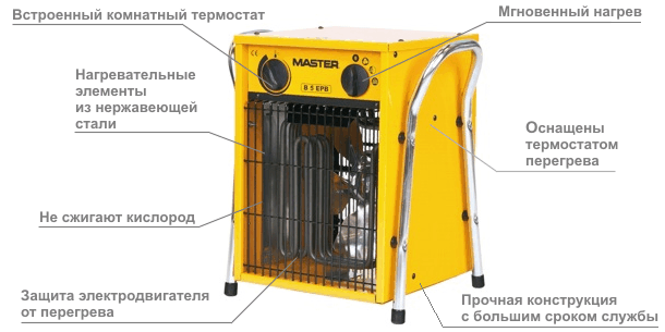 Электрические нагреватели воздуха MASTER B 5 являются универсальными нагревателями, применяемыми во многих сферах. Это оборудование идеально подходит в качестве временного источника обогрева благодаря своей мобильности и простоте обслуживания. Для производства электрических нагревателей Master используются комплектующие высокого качества, обеспечивающие надежность и эффективность этих приборов. MASTER B 5EPB Описание модели: -Встроенный комнатный термостат -Не сжигают кислород -Отсутствие дыма, запаха и конденсата -Переключатель “летний - зимний” режим работы (только для вентиляции) -Низкий уровень шума -Функция автоматического перезапуска -Защита электродвигателя от перегрева -Нагревательные элементы из нержавеющей стали -Термостат для защиты от перегрева -Регулировка мощности -Прочная конструкция с большим сроком службы Технические характеристики Поток воздуха: 510 м3/ч Тепловая мощность: 2,5 / 5,0 кВт Размеры (ДхШхВ): 370 x 310 x 390 мм Питание (В/фаз/Гц) : 3N 400/50-60 В/Гц Вес