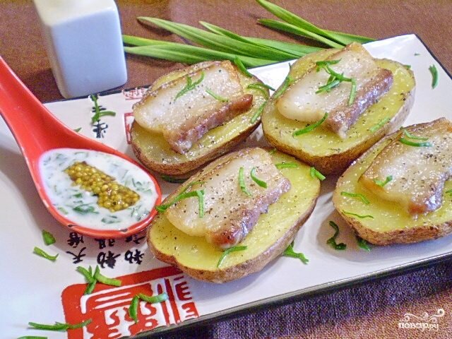 На сухой противень выкладываю очищенный картофель, с соленого сала срезаю шкурку, сало нарезаю кусочками 2x1,5 см и накалываю зубочисткой на клубни. Ставлю в разогретую до 180° духовку и запекаю до готовности (сало станет цвета какао с молоком, а картошечка — мягкой).