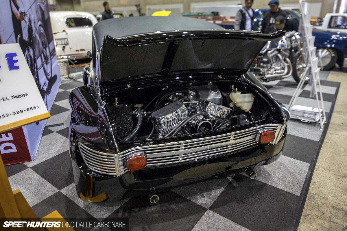 Mooneyes’ Yokohama Hot Rod Custom Show это место, куда кастомайзеры стекаются за впечатлениями. Можно заметить, как градус шоу нарастает и как эта сцена в Японии продолжает развиваться. Прежде чем поделиться материалом о событии в общем, я просто должен показать вам эту Mazda Carol. Вы смотрите на маленький кей-кар 1960-х годов, первый четырехдверный автомобиль Mazda, чтобы быть точным, который первоначально был оснащен небольшим четырехцилиндровым двигателем OHV на 358 см³. Но многое изменилось с тех пор, как этот автомобиль сошел с конвейера, и все благодаря Praise Body Factory в Нагойе. Мастерская специализируется на мотоциклах и автомобилях, поэтому, я думаю, объединение этих двух направлений однажды было неизбежно. Вот так и появилась эта накачанная и расширенная Carol. Он выглядит потрясающе в глянцевом черном цвете с хромированными акцентами, но визитная карточка этого творения скрывается под капотом с кастомной вентиляцией. Это двигатель Harley Davidson V-Twin. Двухцил