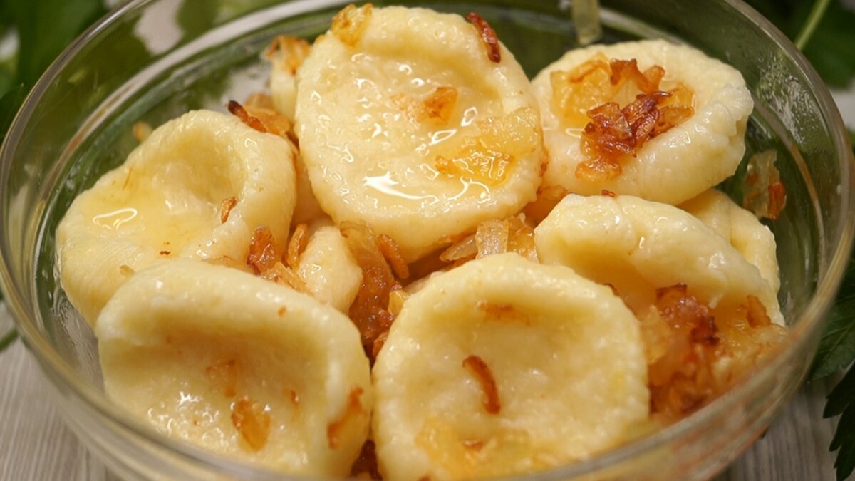 Для приготовления этого аппетитного блюда потребуется минимум времени и продуктов. «Ленивчики» получаются нежными и вкусными. Мои домашние их просто обожают. Рекомендую приготовить. -Возьмем: - 500-600 г картофеля; - стакан муки; - 40 г масла сливочного; - 2 яичка; - соль по вкусу; - 1 крупную луковицу; - растительное масло (оно потребуется для жарки лука). Картофель очищаем и отвариваем. С готового картофеля сливаем всю воду, кладем в кастрюльку масло сливочное и тщательно растираем. Даем картошке остыть. Добавляем к остывшей картошечке яички и муку, подсаливаем по своему вкусу и замешиваем. В итоге тесто у нас должно получиться достаточно мягким и слегка липким. Если тесто буквально «плывет», добавьте еще немного муки. Формируем из картофельного теста «ленивчики». Проще всего это сделать, скатав тесто в колбаску и отрезая от него небольшие кусочки. Отвариваем «ленивчики» в кипящей подсоленной воде (можете добавить в нее лавровый листик) буквально пару-тройку минут (после тог