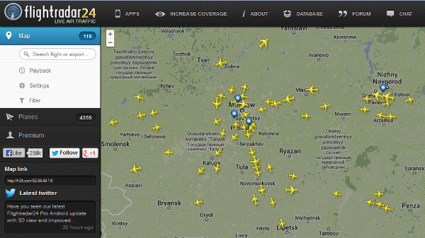Самый лучший интернет-сервис по отслеживанию пролетающих в небе самолетов — это сайт Flightradar24. Сайт открытый и позволяет в реальном времени отслеживать положение самолетов, находящихся в воздухе. Слежение происходит только за теми воздушными бортами, где установлена система ADS-B. ADB-S ставится на все новые пассажирские и грузовые самолеты. Устаревшие пассажирские, военные и частные редко имеют ADB-S. Для получения сигнала используются ADB-S приемники (в основном радиолюбительские) с дальностью 100-400 км. Полученные данные отправляются на сервер Flightradar24 и сразу выводятся на интерактивную карту. Поэтому мы не видим информацию о самолетах, летящих над океанами — там нет приемников. Удобно то, что кликнув по иконке летящего самолета, вы можете получить дополнительную информация (фотография, тип самолета, бортовой номер, авиакомпанию, место и время отправления и посадки). Сервис записывает историю полетов за последние 4 недели. Сервис работает в веб-браузерах,