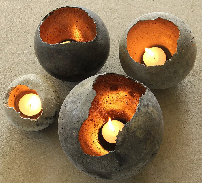 Самый обыкновенный бетон - прекрасный материал для изготовления самых разных аксессуаров для интерьера. Лично мне очень нравится сочетание бетона и огня. Поэтому сегодня я хочу рассказать о простых, доступных каждому способах изготовления подсвечников из бетона. 1. Подсвечники-шары Выглядит невероятно красиво - но на самом деле ооочень просто сделать. Все мы помним из детства изготовление игрушек и форм из папье-маше. Иными словами, из рваной склеенной бумаги. Тут принцип схожий. Надуваем шарики и покрываем сверху ровным слоем бетона. Шарики затем лопаем, внутреннюю поверхность покрываем, например, золотой краской. Она особенно красиво будет отражать пламя свечи. Внешнюю поверхность шлифуем наждачной бумагой крупной зернистости. 2. Подсвечники круглые из бутылок Чтобы сделать такую форму нужно налить бетон в обычные обрезанные пластиковые бутылки. Бутылки после застывания убираем, бетон шлифуем. Такие подсвечники станут украшением интерьера в стиле лофт. Лаконично, стильно, натуральн