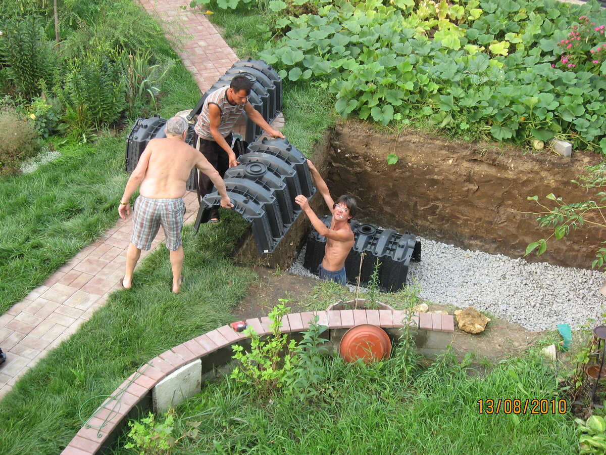 Исходя из УГВ, равному 3 метрам, низ фильтрующего сооружения может находиться не глубже 2-х метров от поверхности земли. Если септик недалеко от дома (сейчас пока не думаем о том, какой будет септик, на данном этапе это не важно), допустим в пяти метрах от него, при самотечной (энергонезависимой схеме работы автономной канализации) и ровном рельефе участка, подводящая к фильтрующему сооружению труба будет находится на глубине 0,7-0,8 метра (для климатических условий Подмосковья). То есть, мы располагаем высотой 2,0-0,8=1,2 метра. Двадцать сантиметров отнимаем на щебеночное основание, остается один метр на рабочую глубину колодца.