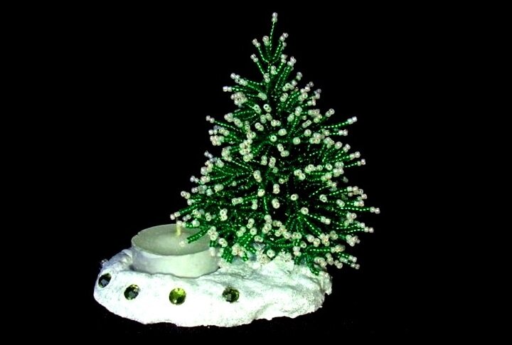 Предлагаем вам мастер-класс по изготовлению подсвечника, основой которого станет новогодняя елочка из бисера. Эту идею сможет воплотить даже начинающий мастер – никаких особых навыков и умений вам не понадобится, все очень просто. На выходе у вас получится очень милый и симпатичный праздничный сувенир, который можно будет использовать в качестве самостоятельного украшения или элемента какой-либо композиции. Что нам понадобится? Как плести елочку? Начинаем с изготовления еловых веточек. Для этого берем кусок проволоки, закрепляем на его конце белую бисеринку, а затем сгибаем его пополам и просто вдеваем через свободный конец бисеринки (от 7 до 15 штук). Сплетаем несколько веточек между собой. Таким образом мы делаем несколько еловых бисерных веток. Соединяя элементы, концы проволоки туго скручиваем между собой. Все концы крутятся по часовой стрелке. Число веточек зависит от желаемого размера поделки. Если хотите сделать небольшую елочку, вам хватит и 15-16 штук. Скрутите все ветки между