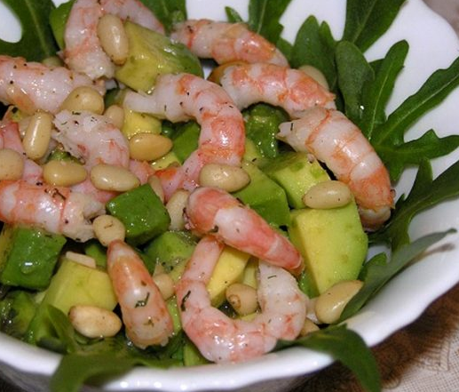 Вкусный и очень легкий салат, способен стать украшением праздничного стола! Если вы думаете, что приготовить на Новый год, это то, что вам нужно! Ингредиенты 300 гр. очищенных креветок 1 авокадо 1 огурец 30 гр. кедровых орехов 1\2 лимона Зелень по вкусу Соль и черный молотый перец по вкусу Оливковое масло Приготовление Креветки обжариваем на растительном масле пару минут. С авокадо снимаем кожицу, отделяем мякоть от кожи и нарезаем кубиками, и поливаем выжатым лимонным соком, пожалуйста, не игнорируйте эту процедуру, она убережет авокадо от потемнения. Очищаем огурец от кожицы, нарезаем квадратиками и аккуратно смешиваем с авокадо, добавляем соль, черный молотый перец и перемешав, выкладываем на блюдо с любимой зеленью, поливаем оливковым маслом, затем посыпаем слегка обжаренными кедровыми орехами. Приятного аппетита!