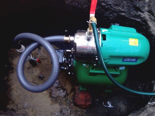 Первым делом я, пообщавшись с соседями, выяснил, к кому можно обращаться за высокотехнологичной помощью. Обзавёлся нужными номерами телефонов. И вот через неделю мне во дворе уже устраивали скважину. Приехала компания из троих товарищей, достала нехитрый скарб, и при помощи ручного труда и насоса для воды углубила обсадную трубу на глубину 32 метра. Как так, спросите вы, никто ничего не бурил машинами, не загонял ЗИЛ с буровой установкой? Нет. Все проще. Тут вода на глубине от 25 метров, есть и ещё мельче. Внутрь обсадной трубы вставляется трубка на полдюйма, к ней цепляется шланг, в который подаётся вода от насоса. Получается, что вода под давлением вымывает грунт перед обсадной трубой и обсадная труба углубляется. Трубы постоянно удлиняются при помощи электросварки, глубина проникновения растёт, жижа из обсадной трубы льётся на двор, насос качает, мужики смеются, собака лает, караван идёт... Потом ууууууууух - вода ушла в трубу. Все, мы вбурились туда, куда надо, достаём проливную трубку обратно и отрезаем её части болгаркой. Обсадная труба, естественно, остаётся в земле. Ура, мы с водой. Вода у нас тут в меловом горизонте, поэтому при прокачке первое время течёт вообще молоко, потом все промывается и идёт чистейшая водичка. Много водички, хоть облейся.