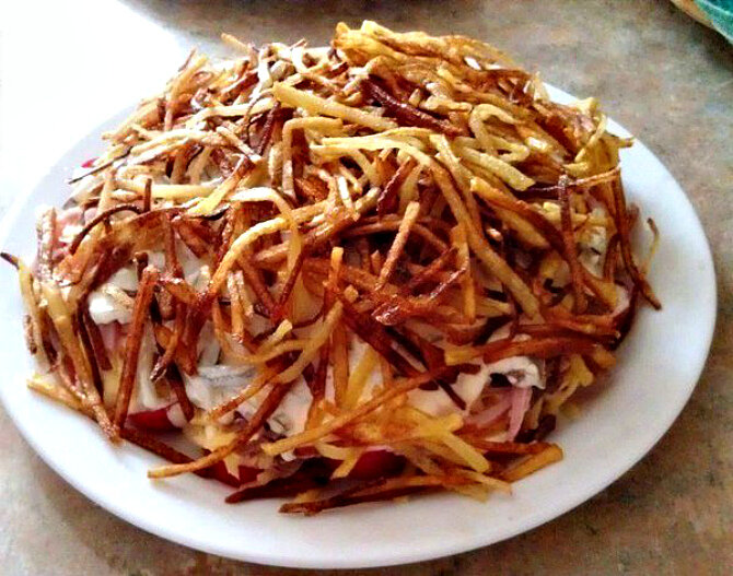 Этот салатик на столе не задерживается, уж поверье. Попробуйте приготовить, и он станет одним из самых любимых. Чтобы приготовить салат «Блондиночка» нам потребуется взять: - 3 крупных клубня картофеля; - 4 свежих помидора (небольших); - 150 г сырокопченой колбаски; - 100-150 г сыра твердого (можно использовать «Пошехонский», Костромской» и т.д.) - зубчик чеснок (если мелкий, возьмите парочку); - майонез для заправки и масло растительное для жарки. Сначала займемся картошкой. Чистим и моем клубни, после этого натираем на терке для приготовления корейской морковки. Промываем натертую картошку в дуршлаге, чтобы удалить лишний крахмал. После этого выкладываем ее на бумажное полотенце, чтобы картошка обсохла. Подсушенную картошечку обжариваем в растительном масле и снова выкладываем на бумажное полотенце, чтобы избавиться от излишков жира. Помидоры нарезаем кубиками и выкладываем на плоское блюдо. Соединяем немного майонеза с пропущенным через пресс чесночком и смазываем помидоры. Нар