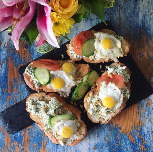 Хотите приготовить быстрый и вкусный завтрак? Например, брускеты. За 10 минут. С паштетом из козьего сыра, ложки сметаны и пригоршни укропа. С аккуратной и немного игрушечной яичницей из перепелиных яиц. С основой из хлеба с хрустящей гриль-корочкой и нежным мякишем. И ломтиками овощей. И россыпью кедровых орешков вместо «вишенок на торте»? Так готовьте! Взбивайте сыр, сметану и зелень в блендере, пожарьте яичницу и немного прокалите орехи на сковороде, чтобы они раскрыли свой маслянистый вкус. Отправьте толстые куски хлеба на гриль, но не пересушите! Выложите сырный паштет на подрумяненный хлеб, сверху перепелиные яйца, ломтики овощей и присыпьте калеными орехами. Это будет вкусно!
