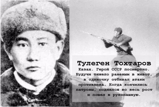 Герой Советского Союз, казах Туленген Тохтаров остался в истории не только за свой подвиг, но и за свои слова: «Прямо смотри в глаза смерти, не моргни. Смерть побоится тебя, и ты победишь». Сам Туленген погиб 10 февраля 1942 года в бою, когда на его окоп, точнее ячейку наступали около взвода немцев. Он отстреливался от них, причем так удачно, что отбил одну атаку, но потом немца начали вторую. Туленген был ранен в живот, но продолжал огонь, пока у него не кончились патроны. И тут он увидел, что на него бежит офицер. Тохтаров встал во весь рост и пошел навстречу. Из последних сил он успел свалить немца ударом приклада по голове, но пуля другого противника свалила его. Во всяком случае, так говорится в наградном листе. Смелый был казах, 30 января 1943 года ему присвоили звание Героя Советского Союза (посмертно).