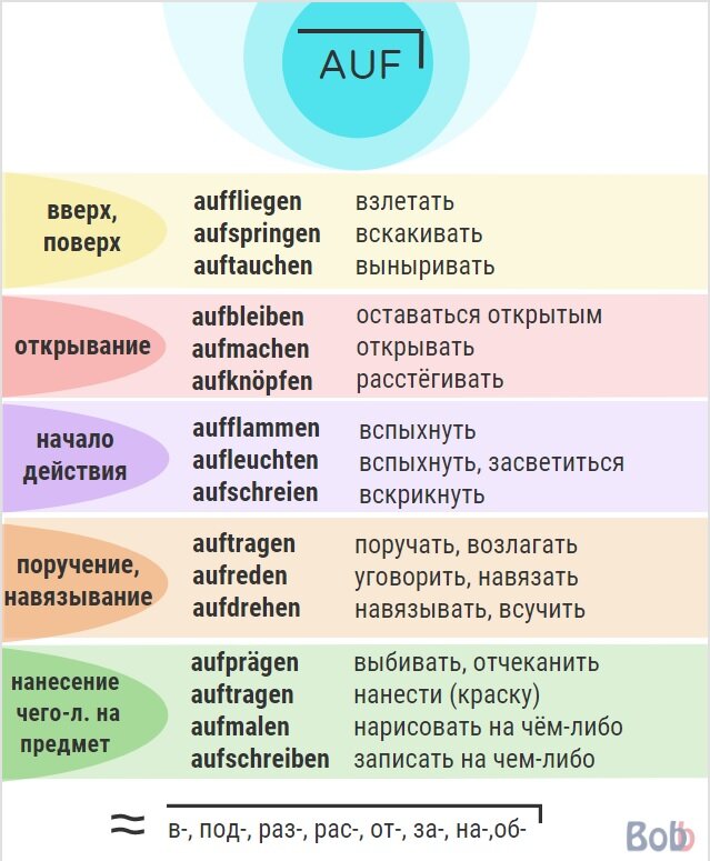 aufsehen - смотреть вверх, относиться с восхищением В этих примерах компонент "на, вверх, сверху" прослеживается без особого труда. Но есть у префикса auf- и другие значения. Иногда эти "сверху" и "на" добавляют глаголу значение "навязывания", "наваливания" какой-то работы: auftragen - и накладывать, сервировать, и поручать, возлагать