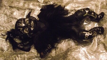 Но тут кукла девочки вдруг ожила и сдернула со старушки черный платок. И девочка увидела, что под платком у старушки нет лица.