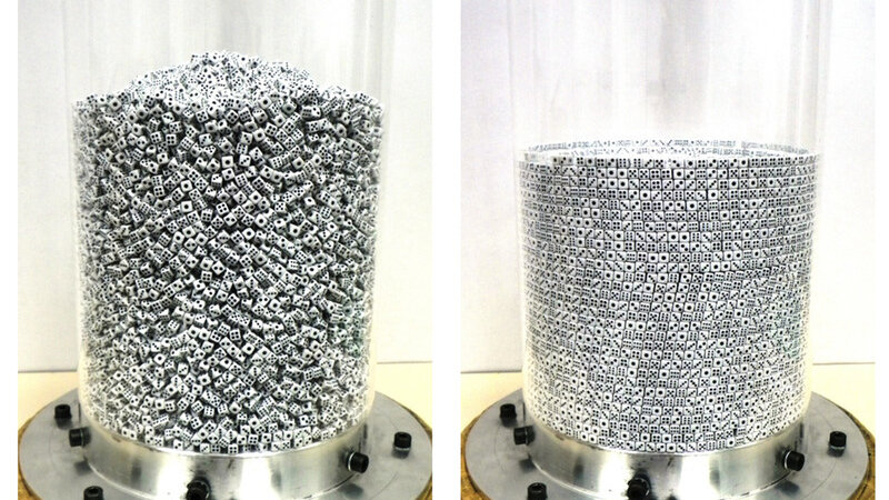 Сортировка 25 тыс. игральных костей имеет удивительно простую физику. Команда испанских и мексиканских ученых заинтересовалась проблемой идеальной укладки кубиков-костей в контейнер и провела эксперимент. Благодаря серии поворотов цилиндрического контейнера с 25 тыс. игральных костей эти «кубические частицы» идеально выровнялись внутри него. «В этой работе мы показали, что кручение контейнера кубических частиц является высокоэффективным способом упорядочивания упаковок», — пишут авторы в статье, опубликованной в Physical Review Letters. Предметы, которые падают на Землю, ускоряется со скоростью около 10 метров в секунду и разгоняются еще на десять метров каждую секунду своего падения. Авторы эксперимента утверждают, что при вполовину меньшей скорости кубики в цилиндрической емкости выравняются после 10 тыс. поворотов. В случае с проведенным экспериментом, где скорость была еще ниже, понадобилось 100 тыс. поворотов. Секрет — в наличии плоских поверхностей у костей: когда при кручении ко