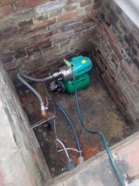 Остался вопрос, как же сделать так, чтобы к насосу был свободный доступ для осмотра и ремонта, плюс чтобы он зимой не замерз и не оставил меня и мою семью без воды. Все очень просто. Роем яму метр двадцать глубиной, обкладываем ее кирпичом, на дно ставим насосную станцию и оттуда же организовываем ввод воды в дом. Просто был написать :). Делать сложнее. Но я справился и получилось вот так (это еще потолок не залит и там люк не вставлен).