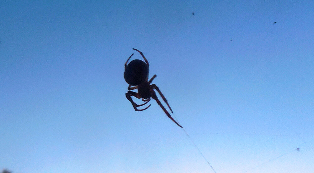 Огромный лесной паук решил сплести паутину на входе в мой лагерь. Видимо подумал, что мухи тоже залетают именно через вход.
