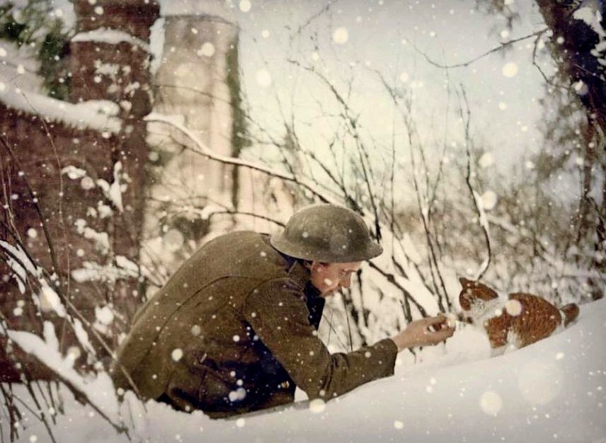 Британский солдат играется с котенком. Нелетт, департамент Па-де-Кале, Франция. 17-е декабря, 1917-го года.