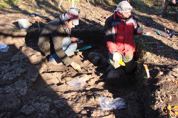 Петербургская осень капризна и своенравна, никогда не знаешь, что день грядущий тебе готовит. Сегодня весь день льет дождь и тепло, целых плюс десять градусов. А завтра – минус пять и все вмерзло. Бывает, зима наступит уже в середине ноября, а бывает – на два месяца позже. Осень того года исключением не являлась. Нередко случалось, когда утро встречало нас легким заморозком и образовавшимся инеем. Работа у нас получалась почти сидячая, согревались как могли. Можно попить свежезаваренного горячего чая, или встать на грохот, попросеивать грунт из раскопа. Вот и расчищен первый погребенный. Точнее – первая. На руке было два бронзовых браслета. В раскопе, между тем, выбран слой связанный с погребениями в каменных оградках. В ногах одного из погребенных – наконечник дротика. Пока идет процесс фиксации, можно немного отдохнуть, еще раз посмотреть последние находки. Бронзовая фибула (без иглы) – застежка для верхней одежды. Вот так у нас выглядела фотофиксация. Несем последние сантиметры кул