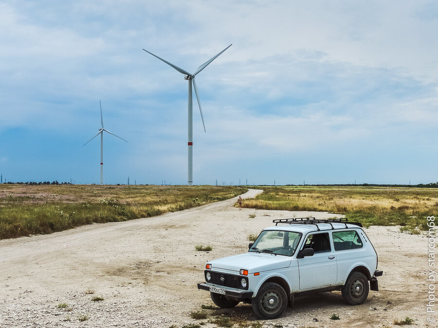 Еще двигаясь через село Новоотрадное и постепенно огибая Казантипский залив мы заметили вдалеке гигантские ветряки Останинской ветряной электростанции. Ради нее стоит отклониться от маршрута и свернуть в глубь полуострова.