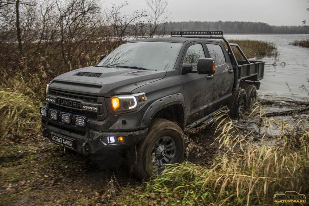 Toyota Tundra 6x6, созданная российскими специалистами, проходит испытания, а Шерп уже стал известен на другом берегу океана Не так давно российское тюнинг-ателье 4x4 Tundra представило прототип первого в мире пикапа Toyota Tundra с колесной формулой 6x6. Пока ведутся работы по созданию компонентов экстерьера - нового грузового отсека, элементов кабины и обвеса, пикап проходит ходовые и ресурсные испытания в Московской области. Недавно парни выехали на Истринское водохранилище, где встретились с еще одним удивительным творением российских инженеров - вездеходом Шерп, который уже стал известен далеко за пределами России (компания открыла представительство в Канаде и других странах и уже продает туда вездеходы). Как рассказал представитель техцентра 4x4 Tundra, шестиколесный прототип прошел всю внедорожную трассу за Шерпом и лишь однажды пришлось воспользоваться лебедкой - на заболоченном берегу водохранилища, где вездеход на колесах низкого давления проскочил поверху, а тяжелый пикап
