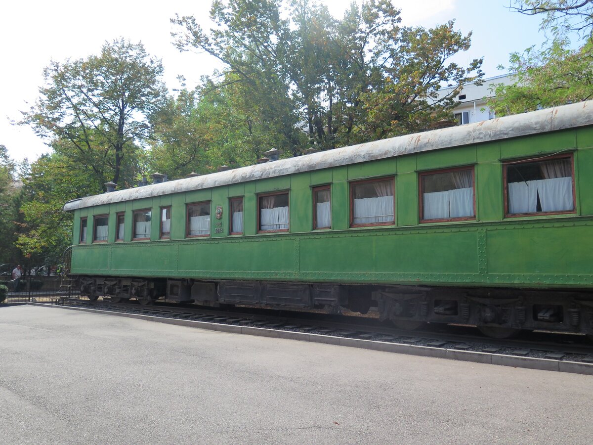 Личный железнодорожный салон-вагон Сталина находится возле музея в Гори. Отец всех народов ненавидел авиаперелеты и за всю свою жизнь летал лишь на конференцию в Тегеран и обратно в 1943 году. Правда в музее вам будут говорить, что и в Тегеран он ехал на поезде, но это бред. Не было там жд путей в то время. Из Баку летели на самолете «Дуглас» С-47. 6-осный удлинённый салон-вагон типа "Полонсо" был передан музею Северо-Кавказской железной дорогой в 1985 году. Вагон весит 83 тонны. Интерьер вагона составляют тамбур, коридор, кухня с электрической плитой, три двухместных купе, ванная с туалетом, кабинет-спальня И.В.Сталина и салон для совещаний. Сталинское купе "генеральского" типа , вы видите походную полку. Туалет, умывальник и душ. Зал для совещаний, облицован красным деревом. Тут проходили совещания и обеды. В углу - то самое кресло вождя. Купе личного секретаря. Купе охраны.