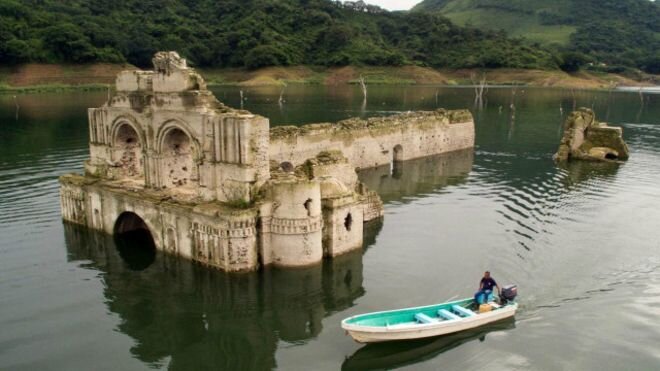 В ноябре прошлого года мир облетело мистическое изображение римо-католического храма XVI века, развалины которого внезапно проступили из воды в мексиканском штате Чьяпас. Храм перестал действовать еще в XVIII веке из-за разразившейся в окрестностях эпидемии чумы. В 1966 году во время строительства водохранилища Несауалькойотль уровень воды понизился на 25 метров, открыв при этом старинный храм Сантьяго.