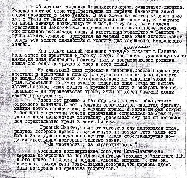 Здесь же недалеко от села располагались и их заводы. Существует легенда, что шикарный храм в стиле барокко был построен чуть ли не на деньги, которые один из крестьян украл у самого Никиты Демидова, откопав припрятанное им золото. Хотя, это может оказаться всего лишь красивая легенда:
