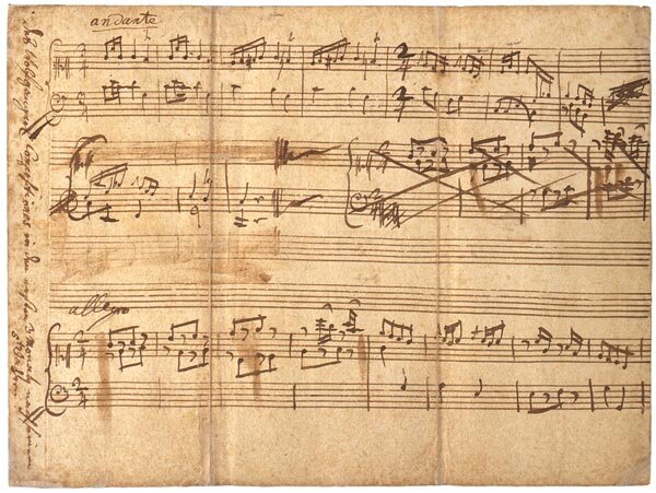 Вольфганг Амадей Моцарт - один из наиболее талантливых композиторов 18 века, оказавший колоссальное влияние на музыкальную культуру мира. Он родился в семье скрипача и дочери попечителя богадельни и на второй день после рождения был крещен, получив имя Johannes Chrysostomus Wolfgangus Theophilus (Gottlieb) Mozart. Уже с 3 лет он учился подбирать мелодии, следуя примеру старшей сестры, а в пятилетнем возрасте маленький Вольфганг сочинял собственные пьески. На фото - первые сочинения великого композитора, собственноручно написанные им: Интересно, что почти до десяти лет Вольфганг боялся трубы, если на ней играли без сопровождения других инструментов, даже один ее вид вселял ему ужас и ассоциировался с направленным в лицо пистолетом. Едва Моцарту минуло 6 лет, он с отцом и сестрой отправился в путешествие, в котором играл перед Максимилианом III, курфюстом Баварии. Отец научил Вольфганга даже играть на покрытой тканью клавиатуре и с завязанными глазами. Графы Герберштейн и Пальфи, побы
