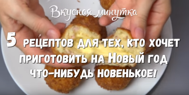 РЕЦЕПТЫ: ---1--- Мясные пирожные. Говядина, тушеная в томатном соке. Вкуснейшее мясо в корзиночках из слоеного теста. Просто и необычно! • Мякоть говядины - 1,5 кг • Лук - 2 шт. • Томатный сок - 400 мл • Слоеное тесто - 400 г • Специи д/мяса • Лавровый лист • Соль ---2--- Вкуснее оливье! Стоит попробовать - и вы будете готовить этот салат постоянно! Без рецепта гости не уходят! Попробуйте - и на вашем новогоднем столе этот салат заменит "Оливье"! БЕЗУМНО ВКУСНО! • Куриная грудка - 1 шт. • Грибы "Вешенка" - 200 г • Огурец свежий - 1 шт. • Лук - 1 шт. • Яйца вареные - 2 шт. • Майонез - 2 ст.л. • Грецкий орех • Соль ---3--- Вкусное и простое блюдо из картофеля с сырной начинкой. Ароматные, хрустящие картофельные шарики с ветчиной, чесночком и сыром украсят любой праздничный стол! • Картофельное пюре - 500 г • Ветчина - 150 г • Яйца - 3 шт. • Сыр - 100 г • Чеснок - 3 зуб. • Мука - 2 ст.л. • Панировочные сухари Специи • Соль ---4--- Закусочный торт с гри