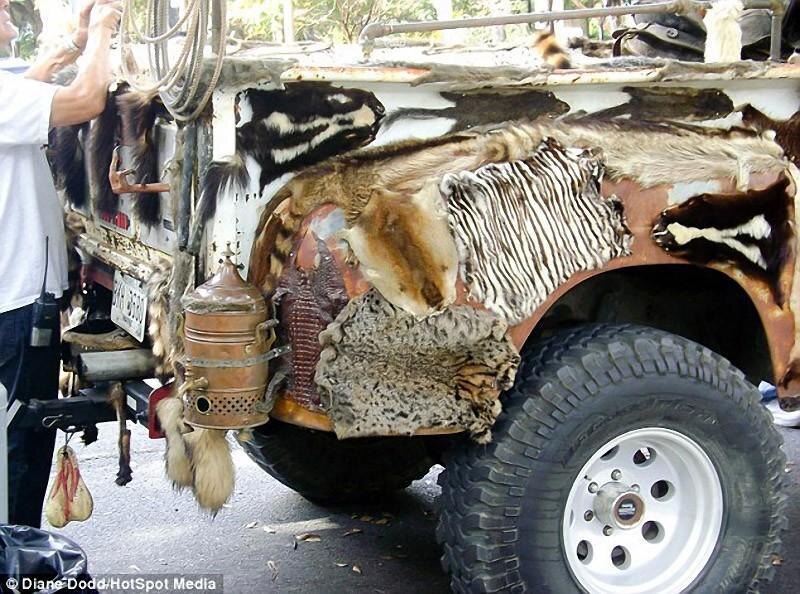 Пикап Ford, который вы сегодня увидите, является одним из самых жутких зрелищ, которое только можно повстречать на дорогах США. Дело в том, что главным украшением автомобиля являются 50 трупов разных животных, которые настолько закрывают авто и торчат отовсюду, что сложно даже разглядеть родную краску этого Ford. (10 фото) 1. Когда вы смотрите на автомобиль, прямо на вас смотрит чучело рыси, расположенное в окружении тушек енотов и сурков. На автомобиле даже можно увидеть лягушку, якобы пьющую Jack Daniels. 2. Впервые водителя тайного автомобиля, украшенного флагом Конфедерации, 43-летняя фотограф Диана Додд встретила в местном магазине в Саванне, штат Джорджия. 3. Додд утверждает, что была просто поражена, впервые увидев это ужасное авто. 4. Женщина не смогла проехать мимо и остановилась, чтобы сделать несколько снимков. 5. Додд уверенна, что мало кто поверил бы в существование такого грузовика, не имея она на руках фото доказательств. 6. Личность водителя и причины, по которым он так