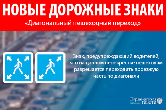 - На российских дорогах в скором времени появятся десятки новых дорожных знаков, табличек и указателей. В их числе «Диагональный пешеходный переход», «Уступи всем, и можно направо», «Въезд на перекрёсток в случае затора запрещён». А уже привычные для россиян обозначения полос и парковки подвергнутся ребрендингу.