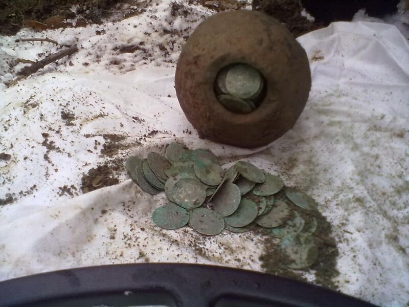 Позвал камрада чтоб тоже попикал своим сафариком, говорит вроде оно. Жалко что видео нельзя сбросить, это было что-то. Убрав снежок, лопата вошла как в масло и во что-то неприятно шкрябнула, выкатилась болванка, бомба, говорит камрад, только не стучи говорит. Начали от болотеца палочкой чистить, горшочек я кричу как очумевший, показались монетки как прессом туда запрессованы.
