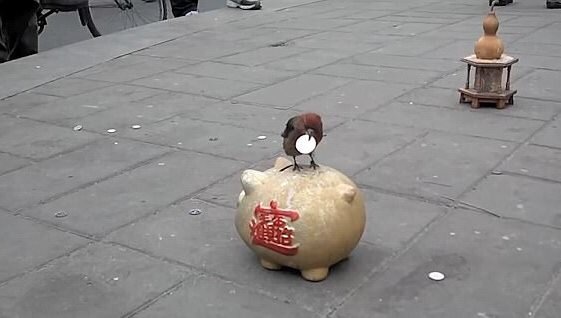 Эта крошечная птичка помогает своему хозяину неплохо зарабатывать. Пернатое собирает монетки у прохожих и умело складывает их в копилку. Оцените уровень тренировки - он высочайший! Миниатюрный казначей отбирает только монетки достоинством 100 юаней (почти 15 долларов), игнорируя другие, меньшего достоинства. Только представьте, сколько может собрать птица на одной из самых оживленных площадей Пекина, где поток туристов никогда не прекращается...