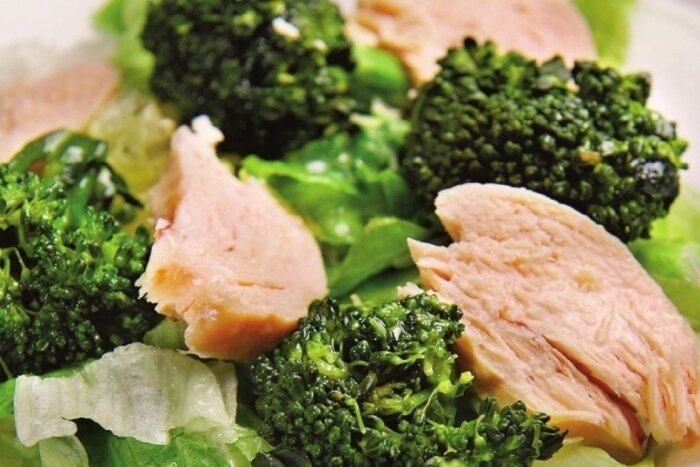 Рецепты из капусты брокколи все еще не слишком распространены в украинской кухне. А вот врачи рекомендуют! Польза брокколи в том, что она как хороший источник клетчатки, помогает эффективно выводить вредоносные бактерии из организма. А вот вся вкусная гадость, которой ты иногда себя "балуешь", как раз задерживает вывод этих бактерий.Брокколи помой и отвари в подсоленной воде 5-7 минут.Обдай ледяной водой и дай стечь. Филе нарежь небольшими кусочками.На тарелку выложи зелень, брокколи, кусочки индейки или курицы. Чуть