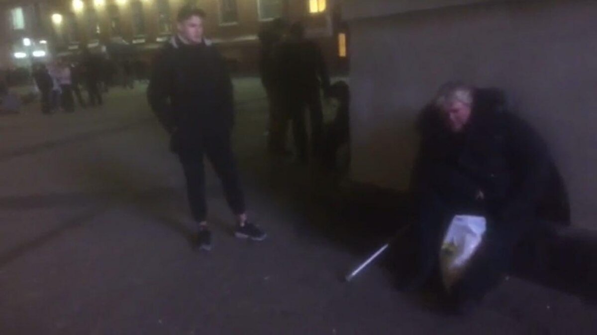 Кадры сделаны 12.12.17г. В Санкт-Петербурге молодой человек избил и издевался над пожилым,бездомным человеком. Инцидент был снят очевидцем,но как видно на фото парень не пугается съемки. Судя по кадрам, все произошло вечером в районе 22:00,поскольку на улице позднее время суток. Все было на виду и у других граждан,ведь происходило все в центре города. На фотографиях видно, как бомж сидит, облокотившись спиной к стене, а парень ударяет ему в лицо ногой со всей силы.