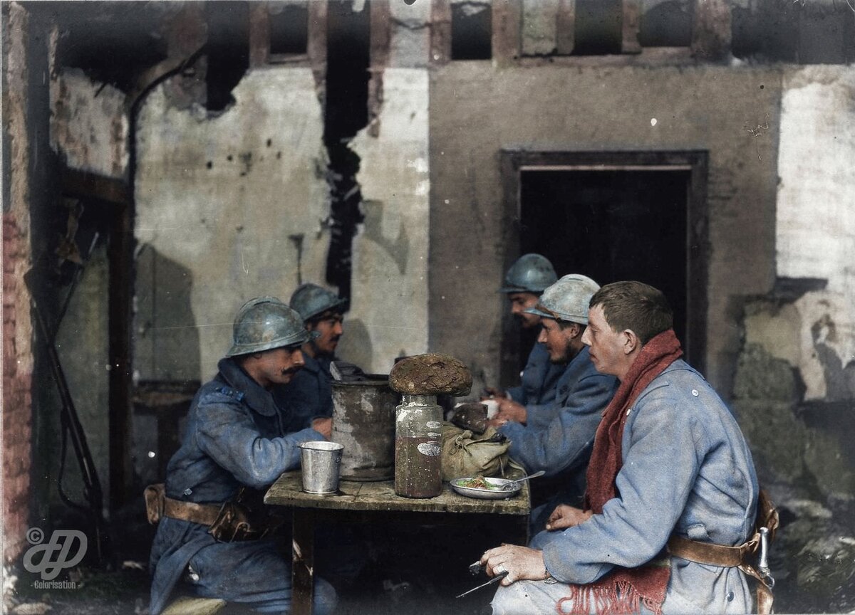 После нескольких дней, проведенных в окопах под проливным дождем, во время Первой Мировой войны, 1915 году. Первый год войны был самым трагичным для французской армии.