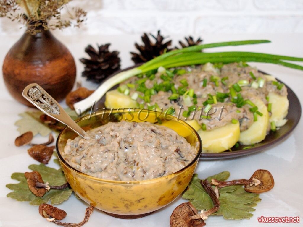 Домашний соус из сушёных грибов с молоком. Грибной соус готовиться на основе соуса «Бешамель», отварные грибы измельчаются и соединяются с молочным соусом. Получается отличный соус для вторых блюд из картофеля, макарон, овощей и крупы. Если вы приверженцы вегетарианской кухни, то грибной соус может стать вашим незаменимым помощником. А в период поста, грибы становятся просто палочкой выручалочкой. Вкус и цвет грибного соуса напрямую зависит от добавленных грибов, если это белые грибы, то и соус получается светлого цвета. В данном рецепте соус состоит в основном из сушеных опят с небольшим добавлением порошка дождевика, поэтому и цвет у соуса более темный. Необходимые ингредиенты: - 40 г. сушеных опят; - 10 г. сушеного дождевика; - 250 мл. воды; - 250 мл. молока (теплого); - 30 г. муки; - 40 г. сливочного масла; - соль и черный перец по вкусу. Как приготовить Грибной соус из сушеных грибов Вы можете посмотреть на сайте.