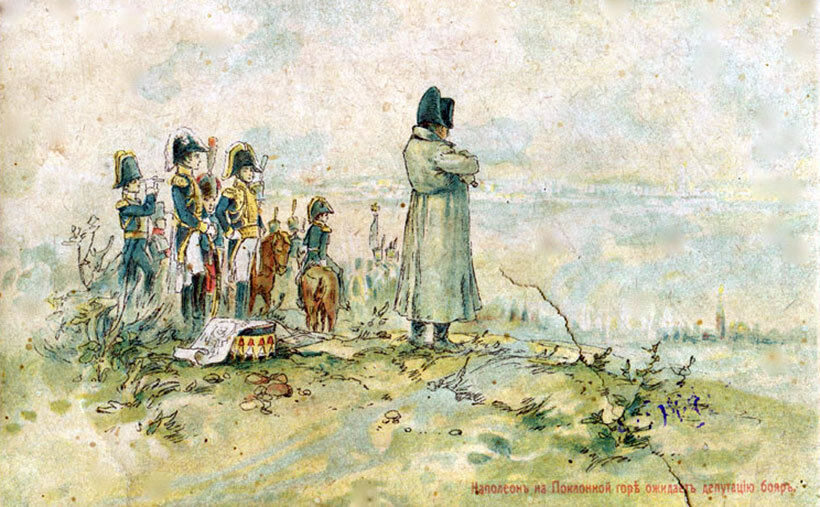 После Бородинского сражения, ослабившего российскую императорскую армию, главнокомандующим М.И. Кутузовым был отдан приказ на отступление. Ради сохранения армии пришлось оставить Москву. 14 сентября 1812 года Наполеон встал на Поклонной горе, с которой долго рассматривал величественный русский город. Некоторым офицерам свиты, представшая картина напоминала восточную сказку. Дождавшись разведки, доложившей, что город практически пуст, и не увидев ключей от города, французы вошли в Москву. Несмотря на недовольство солдат, французский император запретил своим частям мародерствовать в поверженном городе. Сопровождение Наполеона в завоеванную Москву доверилось лишь одной дивизии из так называемой Молодой гвардии с двумя полками гвардейских жандармов. Покинутый город оставлял гнетущее впечатление, хотя все дома были не заперты и внутри царил полный порядок. Встречали оккупантов лишь те немногие жители, которым отступившая армия доверила раненых французов. Вскоре появились первые пожары в де