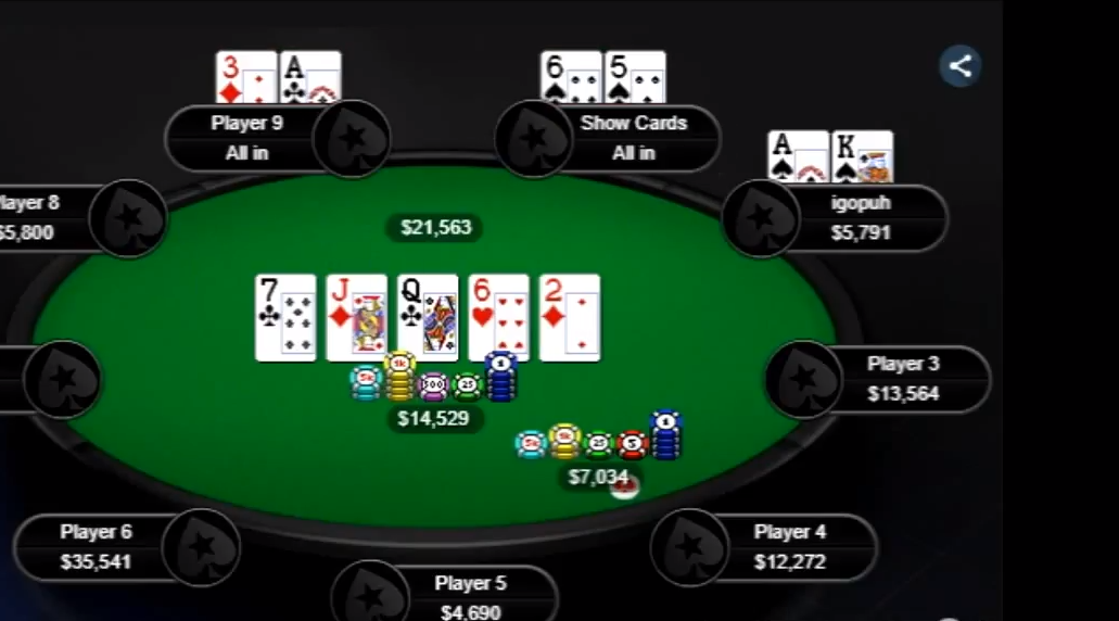 Всем привет. Вот такая раздачка. Турнир, играем,. Все хорошо,до этой раздаачи(((. Идет рейз и за ним ререйз от огра, я 4 бет рейз с АК одномасть, рейзер пуш на 4600, за ним огр пуш на 8000, я думая тоже влился к ним, и что же я там увидел? Туз три рейзер и 56 ререйзер,аааа, как так. Ререйзер ловит 6 и выигрывает огромный банк, пффф. Всем заносов капусты и удачи!