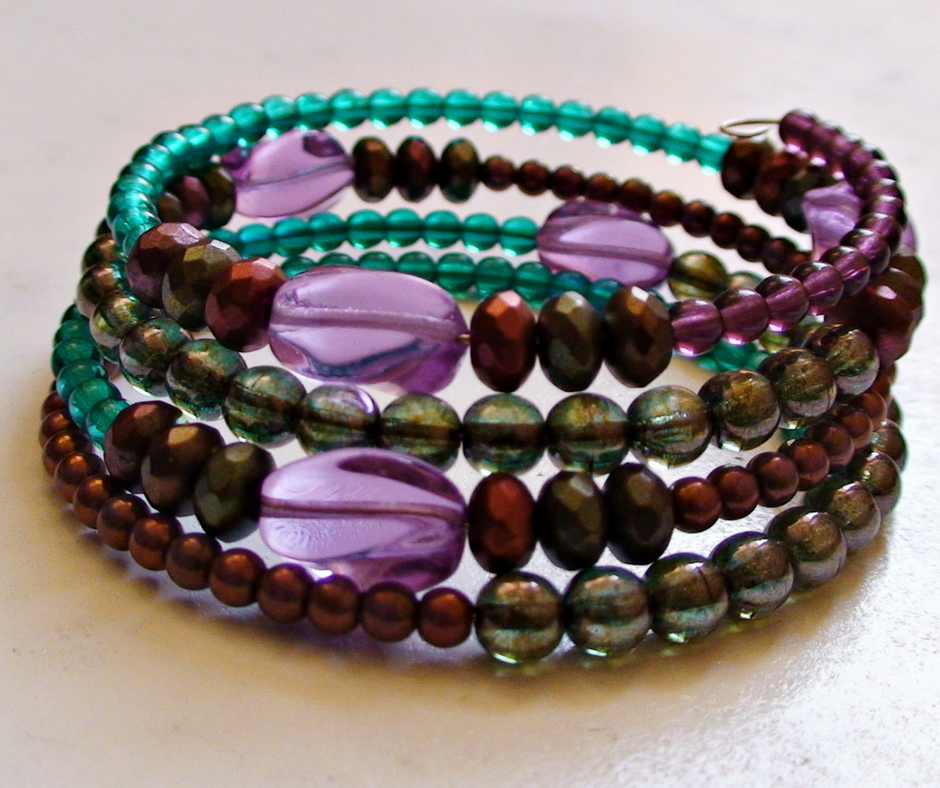 Недавно я собрала вот такое сочетание чешских бусин на мемори-проволоке в ярких осенне-зимних тонах. Не обращайте внимание на обработку концов проволоки, я собирала браслет для вдохновения, чтобы сделать фотографию сочетания цветов :) Стоимость бусин для этого браслета невелика - около 240 рублей. Причем ее можно еще уменьшить, если вместо ронделей с покрытием металлик использовать бусины с тем же покрытием, но либо граненые 4 мм, либо прессованные 5*7.