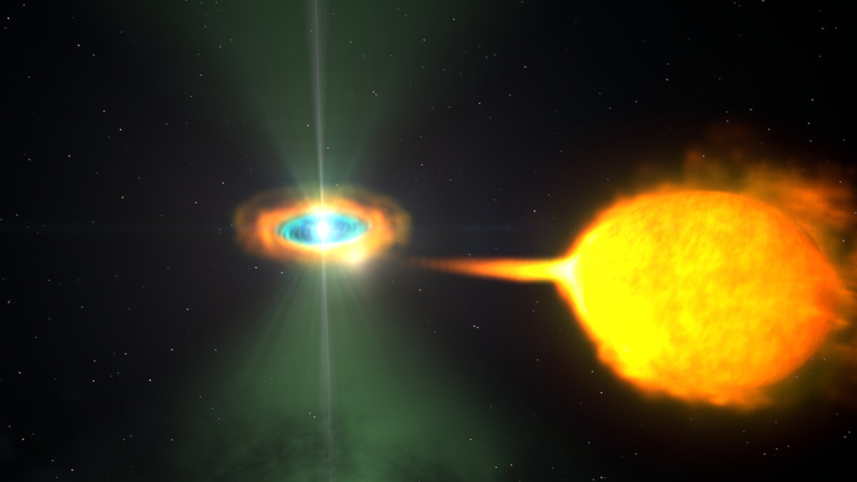 Астрофизикам удалось объяснить странности пульсара PSR J1023+0038. Система представляет собой тандем нейтронной звезды солнечной массы (но диаметром в 70 тыс. раз меньше Солнца) и красного карлика и излучает то в рентгеновском, то в радиодиапазоне. Необычный характер излучения удалось связать с возникновением на поверхности нейтронной звезды «горы» из вещества, перетянутого от соседки, масса которой составляет всего 20% от массы Солнца. Величина «горы» вряд ли превышает несколько миллиметров, однако при колоссальной силе тяжести, плотности и бешеной скорости вращения нейтронной звезды она создает значительную аномалию гравитационного поля, ведущую к возникновению гравитационных волн и нестабильности в излучении.