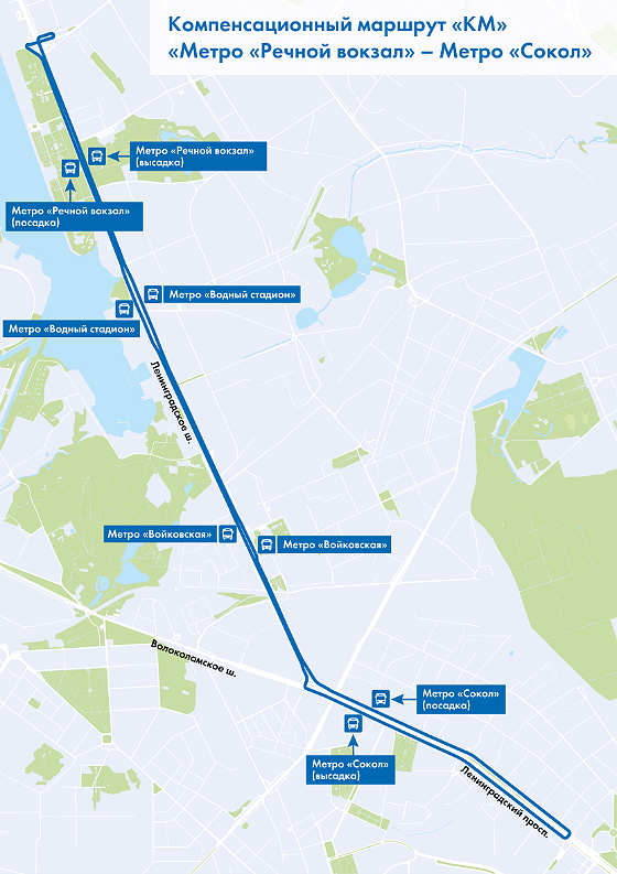 В обычном режиме метро будет работать с 5:30 18 декабря. На время закрытия станций между Речным вокзалом" и «Соколом» будет ходить бесплатный автобус «КМ» с остановками у станций «Водный стадион» и «Войковская». Автобусы будут курсировать с минимальными интервалами — меньше минуты, сообщает пресс-служба департамента транспорта. Место посадки в бесплатный автобус возле «Речного вокзала» располагается на Ленинградском шоссе. Чтобы попасть на остановку с Фестивальной улицы, надо пройти через парк «Дружба» (вход за торговым центром «Речной») к подземному пешеходному переходу и перейти по нему Ленинградку, выйдя к остановке «Северный речной вокзал».