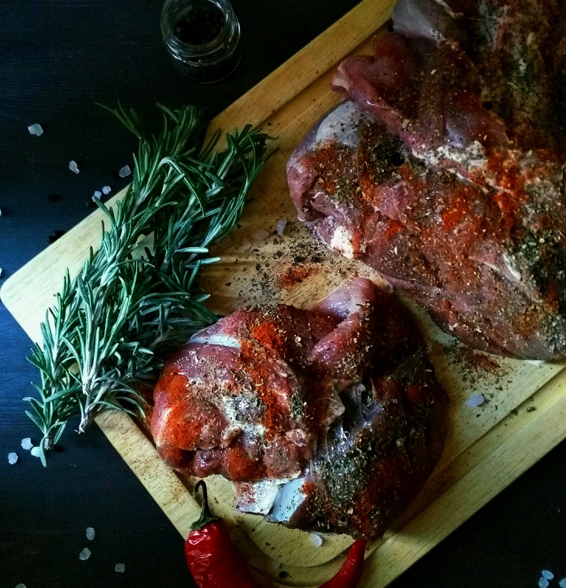 Итак, если вы ожидаете гостей, или просто хотите вкусный ужин, но время на изыски у вас ограниченно, просто замаринуйте баранину, оставьте на несколько часов, а потом вместе с маринадом отправьте в духовку. Телодвижений минимум, результат прекрасный - все как я люблю. 😎😎😎🤗 Берем барашу ( это была нога, порубленная на два куска заботливым мясником на рынке), моем, вытираем бумажным полотенцем и начинаем посыпать и обмазывать :солью, перцем черным, паприкой, немного мяты сушеной, базиликом, идеально добавить ягоды можжевельника( они сейчас продаются в больших магазинах, в разделе специи), немного розмарина ( мо
