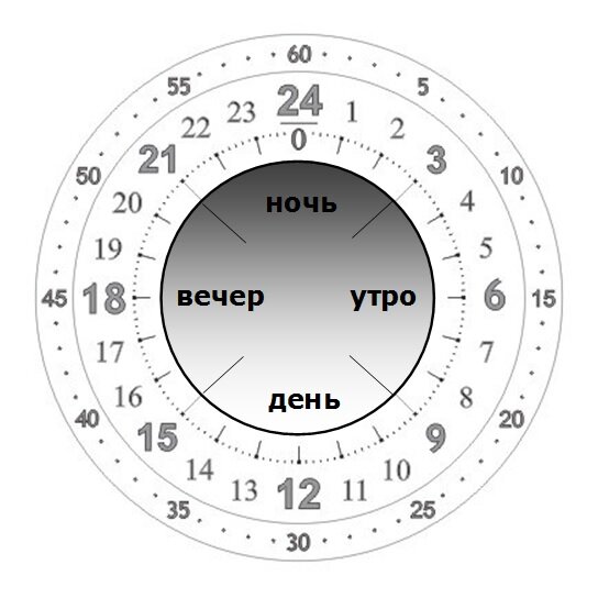 У большинства из нас, на стене висит одна из главных подсказок, как на самом деле устроен мир! Так часто бывает, смотришь и не видишь то что находится перед самыми глазами. Но почему циферблат часов содержит именно 12 делений? Ведь суточный оборот Земли вокруг своей оси – это 24 часа или два раза по двенадцать часов! Скажите, кто-нибудь пользовался часами с циферблатом в 24 часа? И почему? Меня лично этот вопрос, заданный самому себе, просто поставил в тупик. Давайте попробуем сами построить такую модель полного суточного цикла. Очевидно, что в верхней точке такого циферблата находится точка перехода от 24 часов к 00 часов следующих суток. Но вот как правильно расставить фазы такого цикла. Покопавшись в интернете, я нашел единственное достойное изображение 24-часового циферблата. В нем «полночь» расположена, как ей и положено, в середине ночи, а полдень – в середине дня. Но все это как-то противоречит сложившемуся укладу жизни. Скажите, разве может ночь начинаться в 21:00, а день