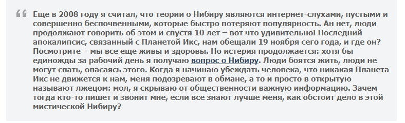 Американское научное ведомство НАСА пришло в бешенство из-за разговоров о приближении Нибиру и выступило с сенсационным заявлением. 77-летний астрофизик НАСА Дэвид Моррисон решил объяснить всему миру, что на самом деле представляет собой планета Х. По словам ученого, никакого смертоносного небесного тела, описанного в шумеро-аккадской мифологии, во Вселенной нет. Как видит происходящее специалист, слухи о Нибиру поползли из заявления Нэнси Лидер. Женщина сообщила, что ей якобы поступило предупреждение о столкновении Земли с Нибиру, от инопланетян с созвездия Дзета Сетки. А конспирологи дали ход этому заявлению. Сам же ученый не верит в мифическую планету Х и старается склонить общественность на свою сторону.