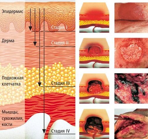 В зависимости от глубины поражения тканей различают несколько степеней пролежней: