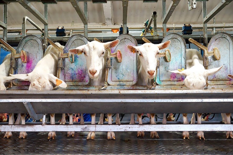 Но, собственно, показать я хочу процесс дойки коз. Никогда не задумывалась, как это порисходит. Вернее, честно говоря, как-то считала, что сидят тетушки и ручками тянут-потянут. Оказалось, что давно существуют крутые доильные аппараты. Например, итальянские. На 48 коз одновременно. Забежали, подоились, побежали дальше. Конечно, не совсем без помощи и участия человека.