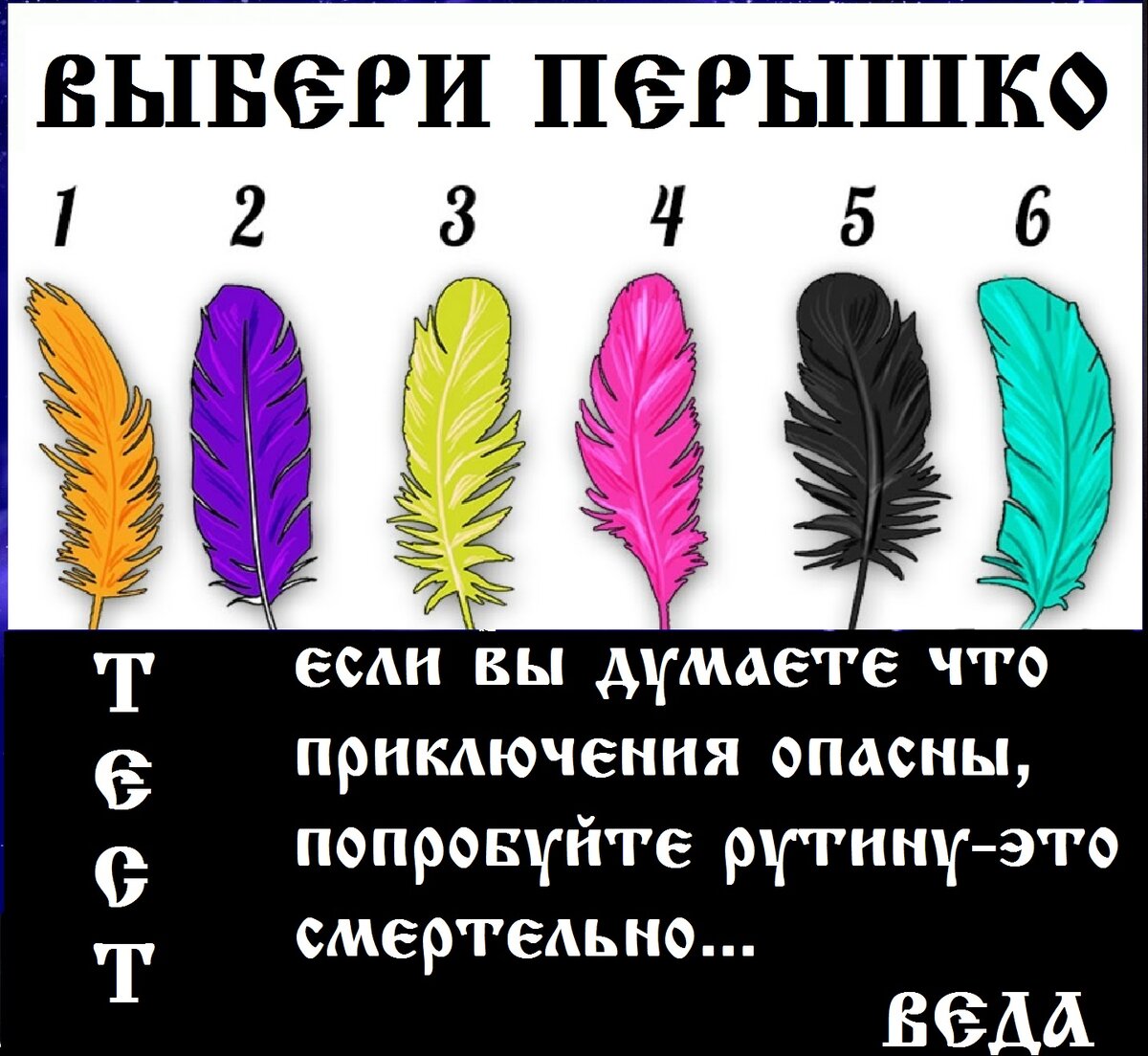 Каждый человек обладает своими уникальными особенностями и характером. Для классификации людей психологи придумывают всё новые способы и критерии. Многие из них основываются на теории цвета и форм, и этот тест — не исключение. Прежде чем читать мой пост взгляните внимательно на эти шесть перьев. Рассмотрите их форму, цвет и выберите то пёрышко, которое Вам больше всего приглянулось или с которым Вы себя идентифицируете. Итак, давайте же узнаем, о чём говорит ваш выбор! Пёрышко 1 Вы — творческая личность. Вы стремитесь везде преуспеть и отличаетесь сильным пробивным характером. Вы перфекционист, поэтому вас способно вывести из колеи, когда что-то происходит не так, как вы ожидали. Пёрышко 2 Вы легко приспосабливаетесь к новой обстановке и условиям. Кроме того, вы очень быстро осваиваете новую информацию и приобретаете новые навыки, однако делать это предпочитаете в одиночестве. Тем не менее, ваши близкие всегда готовы оказать вам поддержку. Пёрышко 3 По своей натуре вы п