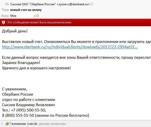 Недавно пришло на рабочую почту письмо от сотрудника Сбербанка. Некто Сысоев сообщил, что выставлен новый счет, который можно загрузить по ссылке, ведущей на сайт «Сбербанка». На самом деле ссылка ведет на другой сайт. И это письмо вовсе не от Сбербанка (почему это так, смотрите в конце заметки). Если же вы не тот сотрудник, кто решает финансовые вопросы, Сысоев просит переслать письмо другим. Не скачивайте файлы и не открывайте скачанные файлы из таких писем. Там наверняка вирус, который зашифрует все ваши документы (тексты, фотографии, отчеты и т.п.). Вам на личную или рабочую почту может прийти письмо от мирового судьи, службы судебных приставов (ФССП), налоговой службы, ГИБДД и других ведомств. Везде под разными предлогами (задолженность, штраф, прайс, счет, отчетность) будут просить скачать файл и открыть его. Внутри будет исполняемый файл, который скачает вирус. Вирус зашифрует все ваши файлы и вы их уже не сможете открыть. Поэтому главная защита: не скачивать и не