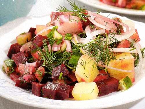 Очищаем селедку от костей и кожи и мелко режем. Мелко режем вареную говядину без жира и 4 анчоуса (анчоусы лучше немного вымочить), вареный картофель, вареная или печеная свекла, два вареных яйца, корнишонов. Все перемешать и выложить в салатник и прибавить 20 штук оливок и каперсов, заправляется салат двумя ложками оливкового масла. Источник статьи: http://hny13.ru/recept-shvedskij-salat