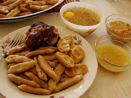 Хьалтам дулх — это одно из самых любимых блюд ингушей. Оно очень простое и сытное. Название можно перевести на русский язык как «галушки с мясом». Это блюдо подают с крепким прозрачным бульоном в отдельной чашке. Мясной бульон готовят заранее из баранины, говядины или курицы. Он должен быть достаточно крепким, а мясо мягким. Больше всего любимы ингушами галушки из кукурузной муки. Для теста понадобятся: горячий мясной бульон - 0,5 литра, соль - щепотка, кукурузная мука – 1 кг. Муку просеиваем через сито, солим и завариваем горячим бульоном, помешивая деревянной лопаткой. Даем массе чуть остынуть и затем месим получившееся тесто. Отщипываем по небольшому кусочку, катаем в ладонях маленькую колбаску и придавливаем ее пальцами, чтобы сформовать плоскую овальную галушку. Делают галушки и из пшеничной муки, для этого готовят такое тесто: мука 0,5 кг, вода 250 гр., 0, 5 куриного яйца, соль по вкусу. Замешиваем довольно мягкое тесто, оставляем его на 15 минут, потом раскатываем тонко и н